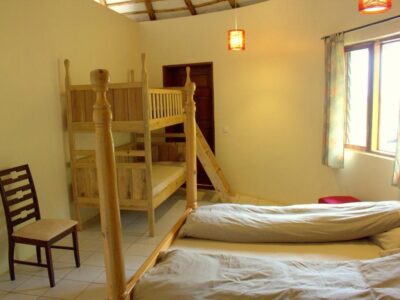 Room 7 is a Banda with a living room, 3 bedrooms and a bathroom. It has a king size bed (spring mattress), a queen size bed and a bunkbed so can accommodate 6 guests in total. The living room has a sofa, TV and a dining table. It has a toilet and shower with bathtub next to the bedroom and is located at the upper level.
